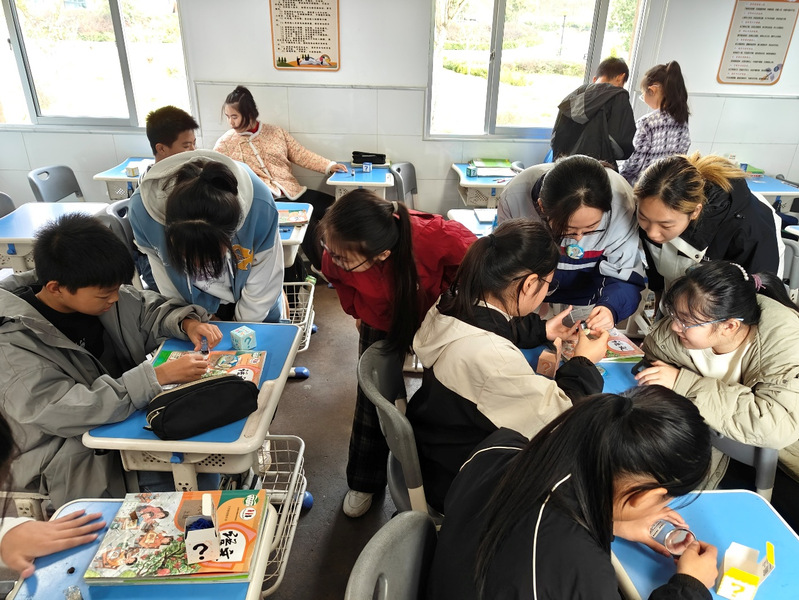 讲座结束后,最令人期待的盲盒抽取环节到来。教室里充满了开盲盒的惊喜与欢声笑语。“老师,这是什么石头?”“我的这块化石是来自什么年代的?”……同学们拿着手中的宝贝,团团围住杨老师和大学生志愿者们,迫不及待地提出自己的疑问。志愿者们耐心细致地一一解答,手把手地教同学们如何观察矿物纹理、辨识化石特征,在轻松的互动中,科学的种子悄然萌芽。