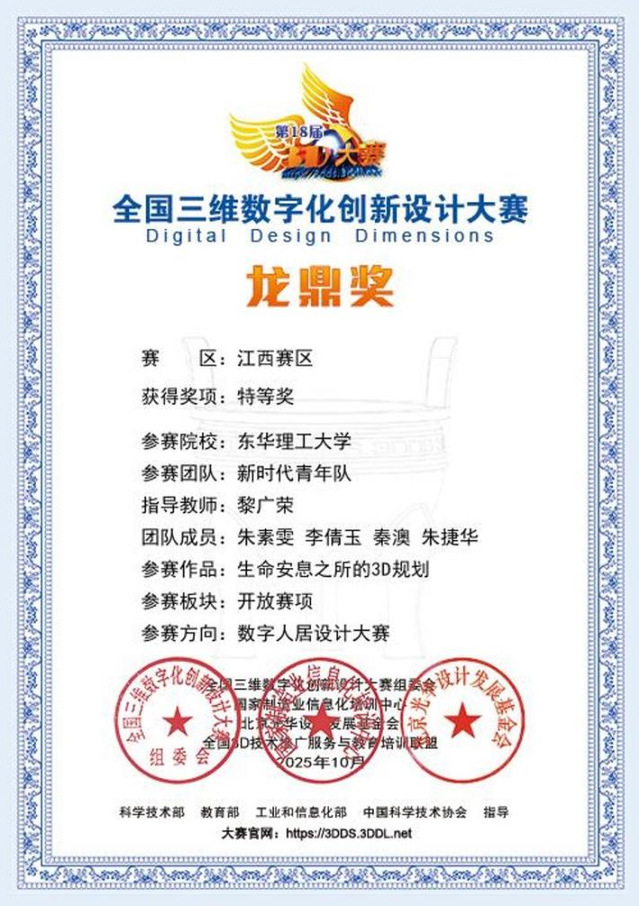近日,2025年全国三维数字化创新设计大赛(以下简称“全国3D大赛”)江西赛区获奖名单公布。东华理工大学地球与行星科学学院朱素雯、李倩玉等同学的作品《生命安息之所的3D规划》(指导老师:黎广荣)获江西赛区特等奖。